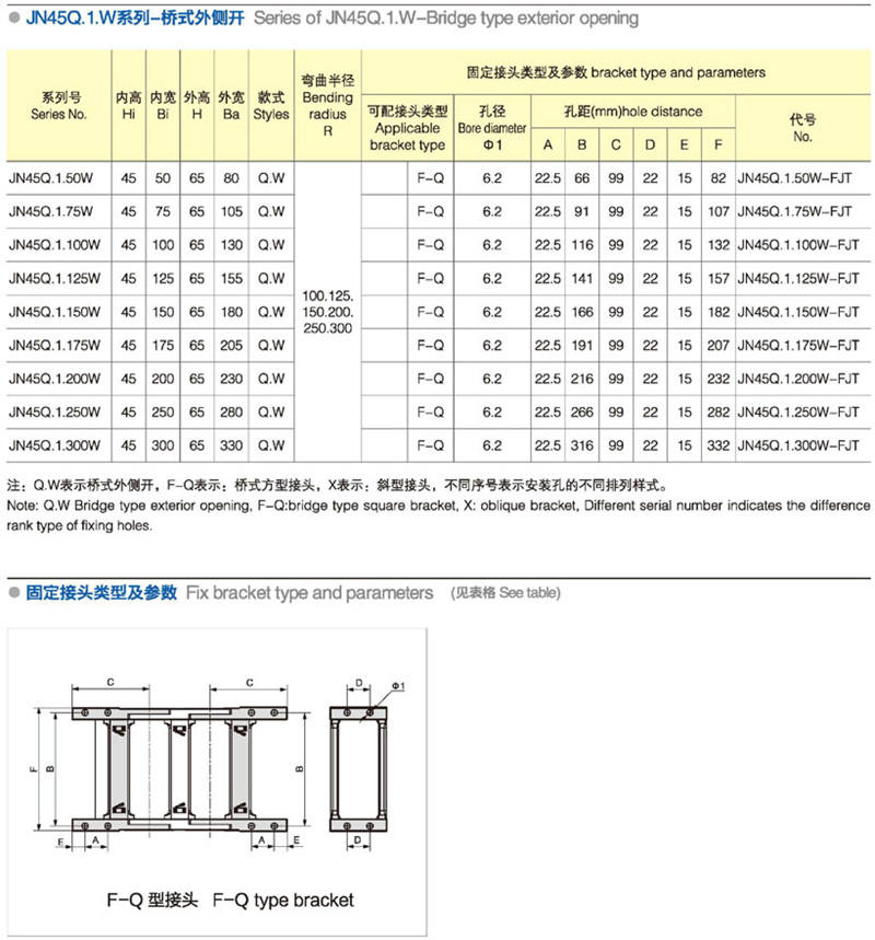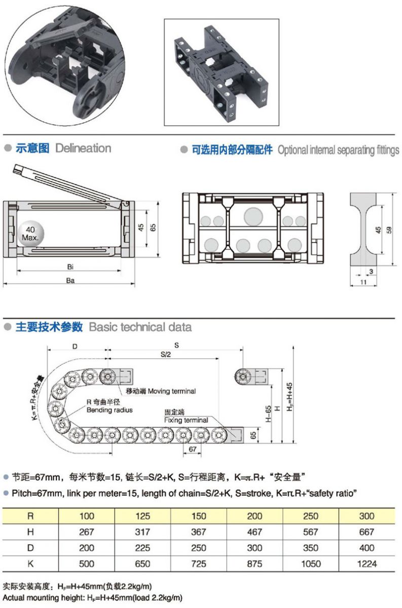 名稱:拖鏈 材質:塑料 分類:中型系列 系列號:JN45Q.1.W 長度:15pitch/m內高:45mm 內寬:50-200mm 彎曲半徑:100125150200250300 應用機械:全部