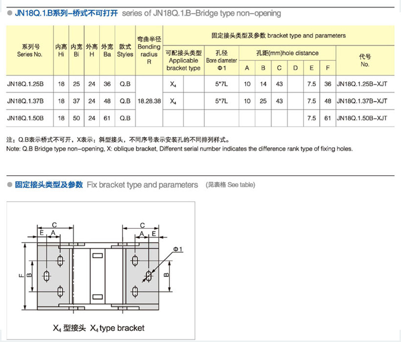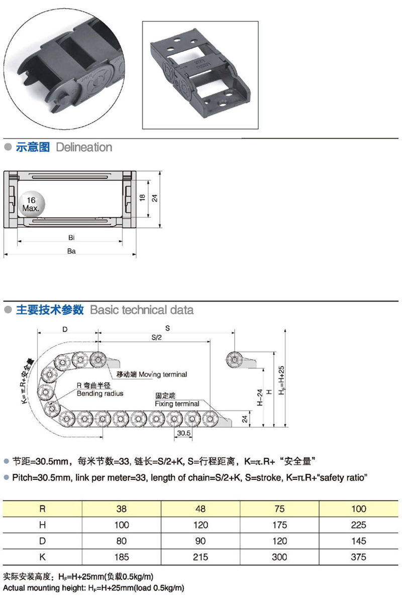 名稱:拖鏈,斗式輸送機 材質(zhì):尼龍 系列號:JN18Q.1.B 長度:33pitch/m內(nèi)高:18mm 內(nèi)寬:25-50mm彎曲半徑:283848 應(yīng)用機械:全部