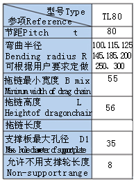 拖鏈型號TL80,支撐板Ⅲ型,彎曲半徑R=125,支撐板寬度Bi=200,拖鏈長度L=6500